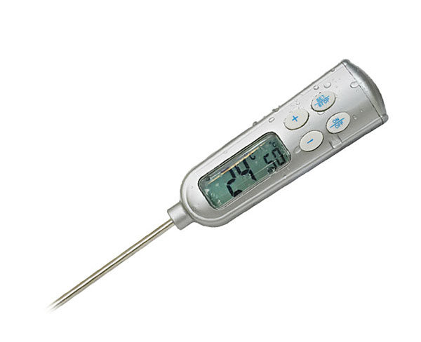 Termometro elettronico tascabile con sonda fissa a punta , color argento ? con allarme di temperatura ,? impermeabile ? incl. batteria (1 x LR44) Dimensioni: 250 x 30 mm . Intervallo di misura: -50 ? C ~ + 300 ? C.